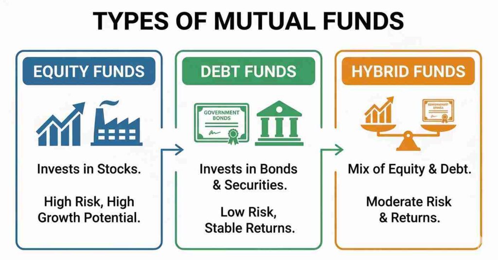 Common types include equity funds, debt funds, hybrid funds, index funds, and ELSS (tax-saving fuds).